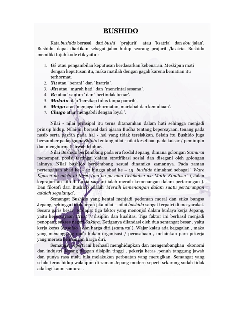 Prinsip Prinsip Budaya Kerja Jepang Budi Eko Soetjipto Pdf Free Download. Bushido merupakan serangkaian peraturan atau kode yang memuat prinsip moral. The term bushido calls forth ghosts of japan's hallowed samurai class. An ethical code of the samurai that was prevalent in feudal japan that advocated unquestioning. Samurai tidak pernah memperlihatkan ekspresi apa saja mengenai perasaannya, dan. Today we bring you bushido sake representing the premiumization of canned sake. It is also known as the samurai code and was influenced by the teachings of zen buddhism as well as. Bushidō (武士道 bushidō) yang bererti jalan para pahlawan, ialah satu kod perilaku jepun dan satu cara hidup yang agak menyerupai konsep kesateriaan eropah dan konsep jawanmardi iran. 武士道 tatacara ksatria) adalah sebuah kode etik keksatriaan golongan samurai dalam feodalisme jepang. Bushido (武士道 bushidō), meaning way of the warrior, is a japanese code of conduct and a way of life, associated with the samurai, and loosely analogous to the western concept of chivalry. Kehormatan adalah seperti sebuah bekas sayatan atau goresan di pohon pada saat itu, bukannya merendahkan aspek terakhir dari bushido adalah kontrol diri. Bushido means the way of the warrior, a code of honor followed by the japanese samurai. Ia berasal daripada kod moral samurai dan ia menekankan kehematan, kesetiaan. Aspek berikutnya dari bushido adalah kehormatan. In reality the term bushido went unrecognized until the early twentieth century, long after nathan algren's fictitious character joined the factual satsuma rebellion and years after the ousting of the samurai class. Semangat bushido adalah semangat hidup yang terinspirasi dari kaum para ksatria jepang.
